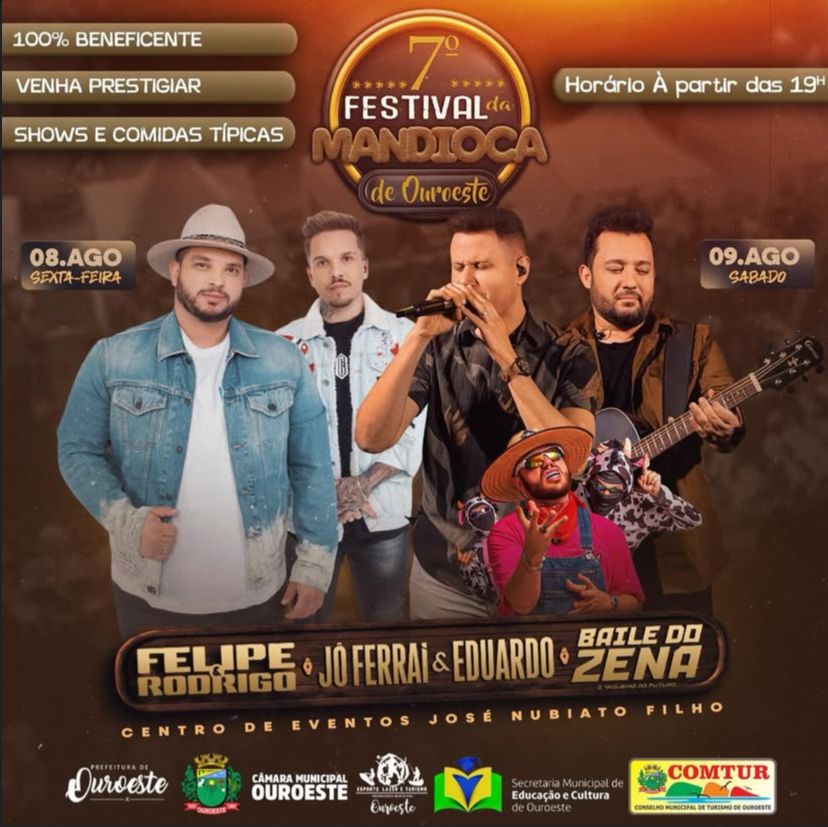 O Centro de Eventos José Nubiato Filho será o ponto de encontro para quem ama boa comida, música sertaneja e tradição nos dias 8 e 9 de agosto (quinta e sexta-feira). O 7º Festival da Mandioca promete movimentar Ouroeste e região com pratos típicos irresistíveis, atrações para toda a família e três grandes shows — com entrada totalmente gratuita.